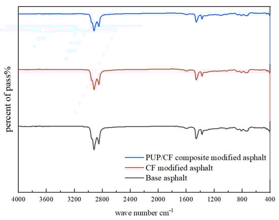 The test results of matrix asphalt, CF-modified asphalt, and PUP/CF composite-modified asphalt are shown in Figure 18.