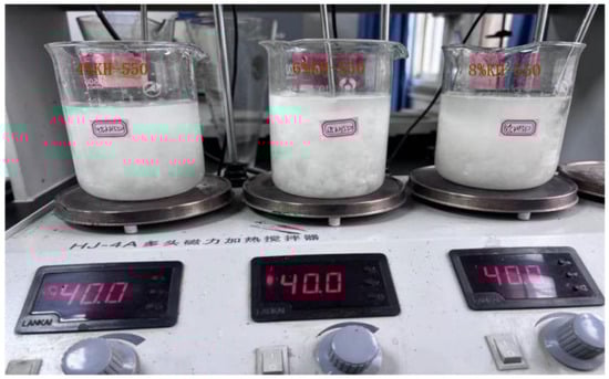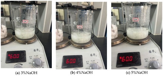 We prepared sodium hydroxide solutions with mass fractions of 3%, 4%, and 5%. We added ceramic fibers to sodium hydroxide solutions of different concentrations, placed them on a magnetic stirrer, heated them to 60 °C, and maintained a constant temperature for 0.5 h. As shown in Figure 19a–c.
