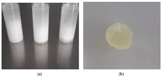 Synthesis. (a) Synthesized PAA-HPC hydrogels: 10 wt.% HPC (left), 7.5 wt.% HPC (center), and 5 wt.% HPC (right). (b) Dried PAA-HPC xerogel with 20 wt.% HPC.
