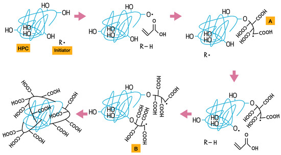 Subsequently, a different hydrogen atom from another site on the cellulose undergoes homolytic cleavage, initiating a new AA polymerization process, as represented in compound B. The proposed final step involves the collision of radicals from the growing linear AA chains grafted onto the HPC backbone [10,18,19,20]. This process of grafting polyacrylic acid chains onto HPC through free radical initiation by oxygen is repeated several times until the polymerization reaction is complete.
