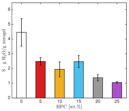 Xerogel samples were immersed in an excess of water at room temperature (25 ± 1 °C) for 3 days during which water was replaced every other day. The swelling capacity (S) was calculated using