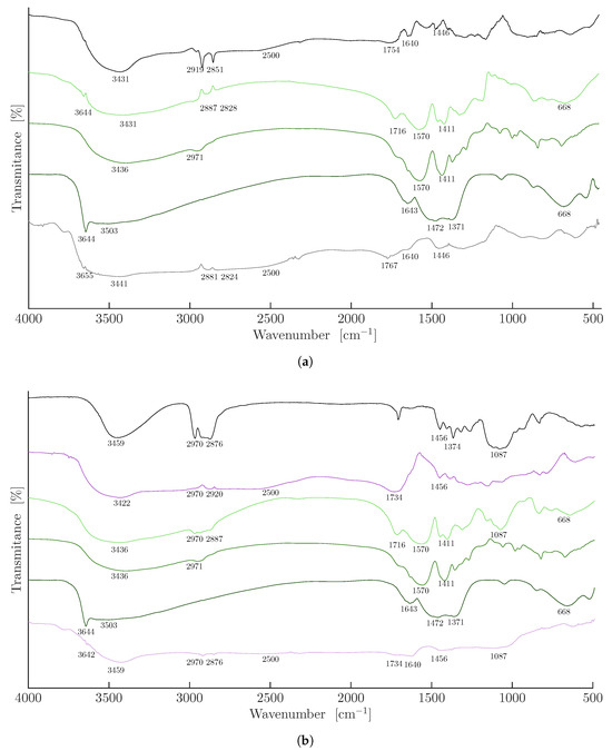 The xerogel samples were prepared in 1 mm-thick KBr pellets, obtained by compression molding (1.0–2.0 mg of xerogel with dried KBr to complete a total of 80 mg for the pellet). The FTIR spectra between 4000 and 500 were recorded using a Spectrum One FTIR spectrophotometer (Perkin Elmer, Waltham, MA, USA). All spectra were obtained at ambient temperature with a resolution of 4 , and 50 scans were carried out for each sample. The final spectra of xerogels were normalized.
