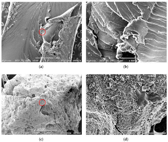 Scanning electron microscopy micrographs of PAA-HPC xerogels: (a) 5 wt.% HPC; (b) close-up of the red-circled region in image (a); (c) 5 wt.% HPC with adsorbed Ni2+ suggesting nickel polyacrylate and Ni(OH)2 crystals; (d) close-up of the red-circled region in image (c).