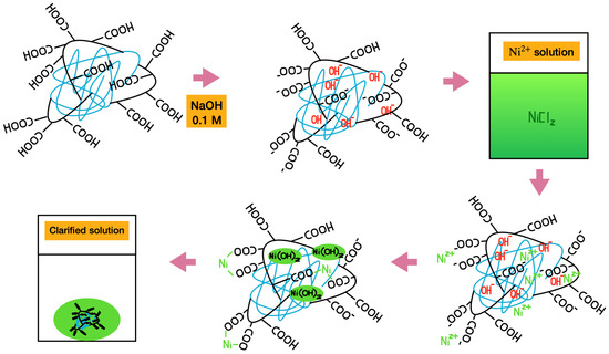 Nickel(II) solution clarification process using PAA-HPC xerogels (spectator ions are present in the system but were omitted to provide a clearer view of the figure).