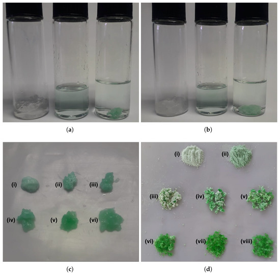 Figure 7b shows the same process as in Figure 7a, applied to the 0 wt.% HPC composition. In both cases, the decrease in hydrogel mass due to collapse and the corresponding increase in solution volume are evident. A similar behavior was observed for the rest of the formulations. As shown in Figure 7c, the filtered PAA–HPC hydrogels after Ni absorption range from 0 wt.% HPC in sample (i) to 25 wt.% HPC in sample (vi), with 5 wt.% intervals between samples. The green color observed in the hydrogels is attributed to the presence of nickel acrylate (light green) and nickel hydroxide (medium green). Pure samples of these compounds are shown in Figure 7d as samples (i) and (ii), respectively. From Figure 7c, it can be observed that the intensity of the green color increases with the HPC content. This suggests that at 0 wt.% HPC, the absorbed Ni2+ is predominantly present as nickel polyacrylate, while at higher HPC contents, Ni2+ is preferentially absorbed in the form of Ni(OH)2. Figure 7d shows the dried PAA–HPC xerogels with absorbed Ni, ranging from 0 wt.% HPC in sample (iii) to 25 wt.% HPC in sample (viii), with 5 wt.% intervals between samples. This figure displays the same color pattern as Figure 7c and further supports the interpretation. This behavior could be attributed to the crosslinking density of the PAA–HPC hydrogels, suggesting that as the HPC content increases, the polymeric network becomes tighter, hindering the neutralization of –COOH groups by hydroxyl ions and leading to the precipitation of nickel through interaction with free hydroxyl groups. After the Ni absorption process, the hydrogels with absorbed Ni2+ were removed from the solution to spectrophotometrically quantify the concentration of Ni2+ remaining in the solution and calculate the amount of nickel adsorbed using Equations (3) and (4). The Ni2+ concentration of the remaining solution after treatment with PAA-HPC hydrogels was quantified using a calibration curve (0–2000 ppm) at 396 nm with a Unico S-2150UV UV/Visible spectrophotometer.