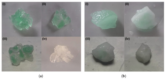 Figure 8 illustrates the Ni release process in 5 and 0 wt.% HPC hydrogel compositions containing absorbed Ni, immersed in 0.1 M HCl solution. For both panels a and b, image (i) corresponds to the hydrogel before immersion, while image (iv) shows the hydrogel after the release process is complete. Images (ii) and (iii) reveal that Ni release begins at the surface and progresses toward the center of the hydrogel, providing evidence of Ni2+ penetration throughout the material.