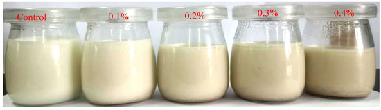 According to the method reported by Moreno-Ortega et al. [35], BGP at the BGP/milk mass ratios of 0%, 0.1%, 0.2%, 0.3% and 0.4% was supplemented with milk. Then, sugar at 8% was further mixed with the milk added with BGP. The above mixed milk was sterilized at 90 °C for 10 min. When the sterilized milk was cooled to 42 °C, 0.2% of the composite starter culture was added to the mixed milk and homogeneously mixed. The above milk was equally transferred into a 100 mL glass bottle and placed in a constant-temperature incubator at 42 °C for 6.5 h. Finally, the fermented yogurt was rapidly cooled to 4 °C in a refrigerator for 12 h to obtain the yogurt product. The yogurt with different levels of BGP was prepared in triplicate.