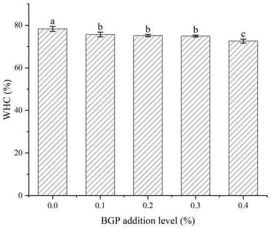 The WHC of yogurt with different levels of BGP. Different letters indicate significant differences (p < 0.05) (n = 3).