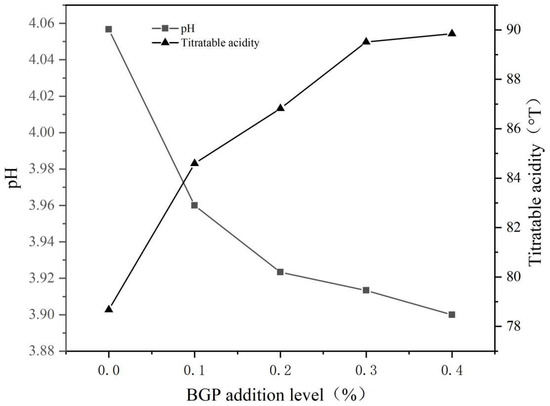 The effects of different addition levels of BGP on the titratable acidity and pH of yogurt are shown in Figure 3. As the addition level of BGP increased, the pH of the yogurt decreased in a dose–effect relationship. The pH of the yogurt with 0–0.4% of BGP decreased from 4.06 to 3.96, while the titratable acidity increased from 78.68° T to 89.84° T. The decrease in pH and increase in titratable acidity might be attributed to the production of lactic acid by lactic acid bacteria during fermentation. Additionally, BGP might contribute to the growth of lactic acid bacteria and increase the production of lactic acid to induce an increase in the titratable acidity of yogurt [22,23]. This is in accordance with the fact that the pH of yogurt also decreased with increasing levels of bilberry pomace power [24].