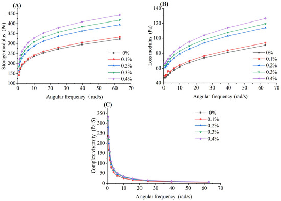 The rheological properties of yogurt with different levels of BGP. (A) Storage modulus, (B) loss modulus, (C) complex viscosity (n = 3).