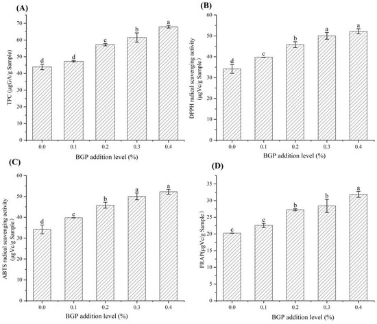The antioxidant activity and TPC of yogurt with different levels of BGP. Different letters indicate significant differences (p < 0.05). (A) ABTS, (B) FRAP and (C) DPPH radical scavenging activity; (D) TPC (n = 3).