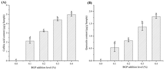 The content of quercetin (A) and caffeic acid (B) in yogurt with different levels of BGP. Different letters indicate significant differences (p < 0.05) (n = 3).