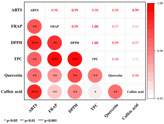 The correlation coefficients between the antioxidant activity, TPC and phenolic monomers are shown in Figure 7. All correlation coefficients between different indicators were above 0.95, suggesting that there were significant positive correlations (p < 0.05) between the phenolic acid content and antioxidant activity of yogurt with different levels of BGP. Therefore, both caffeic acid and quercetin in BGP contributed to the FRAP, ABTS and DPPH radical scavenging activity of yogurt. Similar results also showed that there was a strong correlation between TPC and antioxidant activity of yogurt fortified with apple pomace flour [34].