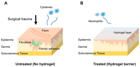 To address these challenges, emerging strategies have focused on modulating the wound-healing response and supporting tissue repair []. Hydrogels, with their injectability, tunable mechanical and biochemical properties, and capacity to deliver therapeutic agents or encapsulate cells, offer a promising platform for improving surgical outcomes [,]. By intervening early in the remodeling cascade, hydrogels may mitigate inflammation, reduce fibrosis, promote angiogenesis, and enhance integration between host tissue and implanted materials [].