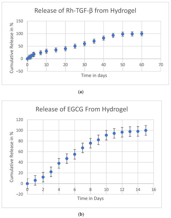 The cumulative release of (a) Rh-TGF-β (n = 3) Standard deviation found to be 0.1 to 0.4509 and (b) EGCG loaded from dual self-cross-linked ADA in situ injectable hydrogel (n = 3) Standard deviation found to be 0.1 to 0.5507.