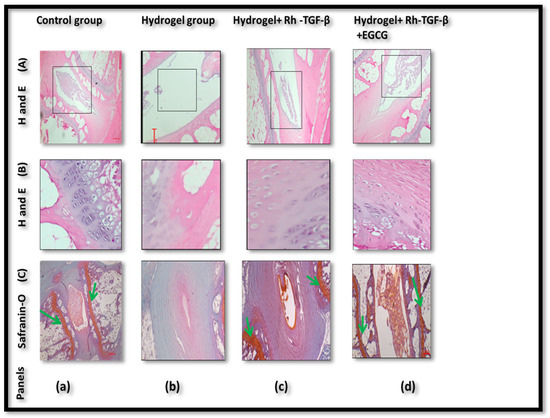 In Figure 4A (control group panel a), the IVD is visible with a well-organized NP and surrounding AF. The rectangular boxed area highlights the intact disc structure, including preserved NP architecture and clear demarcation from the AF. In Figure 4A (hydrogel group panel b), the boxed area shows the IVD region where substantial tissue loss is evident. The NP appears degraded or absent, reflecting advanced disc degeneration. In Figure 4A (Hydrogel + Rh-TGF-β group panel c), the disc structure is relatively preserved compared to the hydrogel-only group. The boxed region identifies the area of the NP and AF with improved architecture, indicating regeneration. In Figure 4A (Hydrogel + Rh-TGF-β + EGCG group panel d), the boxed area of the IVD reveals the most intact and cellular NP and AF region among the treated groups, suggesting a synergistic therapeutic effect. In Figure 4B (control group, panel a), the NP region displays a well-organized cellular arrangement with uniform matrix distribution. The boundary between the NP and AF is distinct, and no signs of structural disruption are evident. This serves as a baseline for normal disc morphology. In Figure 4B (Hydrogel group, panel b), the NP region exhibits clear signs of degeneration. There is a noticeable reduction in cell density and disorganization of the ECM structure. The tissue appears fragmented, and the NP–AF boundary is poorly defined, indicating that hydrogel alone offers limited regenerative support. In Figure 4B (Hydrogel + Rh-TGF-β group, panel c), improved tissue restoration is observed. The NP region contains more cells compared to the hydrogel-only group, and the ECM appears denser. However, the tissue is not fully restored to control levels, suggesting that while Rh-TGF-β supports regeneration, in Figure 4B (Hydrogel + Rh-TGF-β + EGCG group, panel d), the NP shows the highest level of cellularity and structural organization among the treatment groups. Migrating cells from the endplate, arranged linearly and directed toward the NP and inner AF, are clearly visible. These cells have a spherical morphology and single nucleus, indicating active cellular involvement in tissue regeneration. The ECM is densely packed and well-preserved, highlighting the enhanced reparative potential of the combined Rh-TGF-β and EGCG therapy. These observations from H&E staining (Figure 4B) support the hypothesis that dual delivery promotes not only cell migration but also improved ECM integrity, contributing to disc repair. In addition, Figure 4C (Safranin-O staining) provides insights into proteoglycan content, an essential component of NP health. In Figure 4C (control group panel a), the NP region stains intensely red (highlighted by green arrows), indicating abundant proteoglycans in a healthy disc. In Figure 4C (hydrogel group panel b), staining is faint or absent in the NP region, pointing to a severe loss of proteoglycans. In Figure 4C (Hydrogel + Rh-TGF-β group panel c), Safranin-O positivity shows the preservation of proteoglycans (highlighted by green arrows). In Figure 4C (Hydrogel + Rh-TGF-β + EGCG group panel d), intense red staining (highlighted by green arrows) indicates robust proteoglycan retention in the NP matrix, supporting effective ECM maintenance. Collectively, these histological findings across Figure 4A–C demonstrate that while hydrogel alone provides no structural support, the incorporation of Rh-TGF-β improves tissue regeneration, and the combination of Rh-TGF-β and EGCG yields the most significant enhancement in cellularity, ECM organization, and proteoglycan retention—hallmarks of effective IVD regeneration.