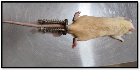 In this work, rat tail IVDs were used to induce disc degeneration. As described, similar to that of Iatridis et al., [36,37] animals were anesthetized using intraperitoneal injections of ketamine at a dose of 50 mg/kg, with additional doses administered as needed to maintain anesthesia throughout the procedure. Under anesthesia, an Elizarov-type miniature external fixator was applied and secured at the base of the rat’s tail to serve as the loading apparatus. The device consisted of four threaded rods equipped with springs and two double rings, forming a compact external fixator. Each ring measured 25 mm in diameter and weighed approximately 1 g. The fixator included four small holes (3 mm in diameter) and a central hole (13 mm in diameter), where M2 nuts were used to secure the 2 mm connecting rods. Under anesthesia, the 7th vertebra at the base of the rat’s tail was palpated and marked. A thin, sterile stainless steel wire (0.8 mm in diameter) was then inserted. Using a precision power drill, a similarly sized sterile stainless steel pin was inserted transversely through the 7th vertebral body at a 90° angle—designated as the compression group (Figure 7). Each set of wires was aligned between the two rings, and the vertebral bodies (7th caudal disc) were fixed to the double rings. The rings were then fastened to the connecting rods using nuts. To apply mechanical load, four calibrated springs (with a stiffness of 0.50 N/mm) were mounted onto each threaded rod and tightened against the distal ring. This setup exerted a chronic compressive force on the disc, immobilizing the region and generating a peak compressive stress of approximately 1.3 MPa—equivalent to the pressure exerted on a human lumbar disc during activities like standing up or lifting a moderate weight. Despite the loading apparatus being in place, the rats were allowed free movement. The compressive loading was maintained for 14 days [36,37]. The injectable treatment was started without loading. The hydrogel was injected directly into the centre of the intervertebral disc space (specifically, into the NP region) using a 26-gauge needle. The hydrogel used in this study had a gelation time of approximately 2.5 min, allowing adequate time for injection before in situ gel formation. Post-injection, the localization of the hydrogel within the disc was confirmed during dissection at the experimental endpoint, where the material was observed to be retained within the disc structure, as shown in Figure 3 of the post-compression group. Subgroups of animals were identified with injectable treatment, as shown in Table 1. During surgery and experimental loadings, rats were allowed unlimited food and water, and the instrumented motion segment was allowed to move freely. The effect of these loading and treating conditions on caudal disc properties was assessed by radiological analysis.