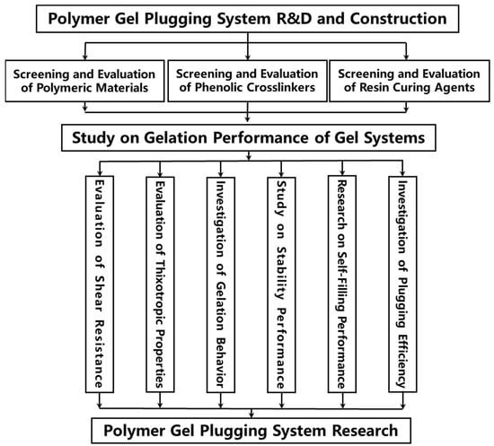A comprehensive literature survey reveals that gel-based LCM technology demonstrates significant engineering applicability due to its self-adaptive plugging characteristics. However, to enhance the one-trip success rate of lost circulation prevention and control operations under complex formation conditions, it remains necessary to develop novel intelligent gel systems with multi-scale responsiveness (e.g., temperature-sensitive/salinity-sensitive/thixotropic types). Furthermore, innovation in LCM placement techniques is crucial. By synergistically advancing material innovation and process revolution, new theoretical support and technical solutions can be provided to address the challenge of lost circulation. Conventional lost circulation materials (LCMs) often fail to effectively plug due to size mismatch with thief zones or susceptibility to dilution by formation fluids. In wellbores and large-scale fracture spaces, conventional polymer gels are easily diluted by formation water and exhibit significant gravitational settling, resulting in poor longitudinal retention and difficulty in achieving effective, complete filling. To tackle the problem of “ineffective plugging post-gelation due to uneven filling of fracture space” associated with polymer gel plugging materials, this study aims to develop a high-temperature resistant polymer gel plugging system and elucidate its mechanisms for wellbore isolation and fracture plugging, thereby providing theoretical underpinnings and technical countermeasures for solving lost circulation problems. The technical flowchart for polymer gel research is depicted in Figure 1.