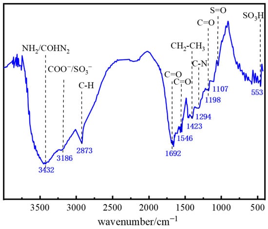 As shown in Figure 2, the FTIR spectrum of polymer J-1 exhibits multiple characteristic absorption bands: a broad, strong peak at 3432 cm−1 corresponds to the stretching vibration of amino (−NH2) or amido (−CONH2) groups; the peak near 3186 cm−1 is characteristic of carboxylate (−COO−) or sulfonate (−SO3−) groups; the absorption band at 2873 cm−1 is attributed to aliphatic C−H bonds. The doublet at 1692 cm−1 and 1546 cm−1 are typical vibrations of the C=O group in amides; the strong peak at 1423 cm−1 is associated with the −CH2−CH3 group in the AMPS structural unit; the absorption peak at 1294 cm−1 corresponds to C−N bond vibration in the NVP structure; the strong peak at 1198 cm−1 reveals the presence of the C=O functional group; absorption peaks at 1107 cm−1 and 553 cm−1 characterize S=O and −SO3H group vibrations, respectively. Based on this FTIR analysis, it is confirmed that polymer J-1 possesses structural features of both AMPS and NVP.