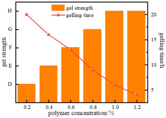 The concentration of the high-molecular-weight polymer has a decisive impact on gel system performance. Excessively low polymer concentration results in insufficient spatial distribution density of molecular chains to support the formation of effective crosslinking points, leading to a discontinuous network structure, difficulty in gelation, or very low gel strength post-gelation. Excessively high polymer concentration causes a sharp increase in apparent viscosity, leading to non-linear growth in shear stress. This directly affects the flow characteristics of the gel solution during injection and can cause rapid gelation, making it difficult to pump the system in a fluid state to the target downhole location. To address these challenges, the effect of polymer concentration variation (0.2~1.2%) on the gelation performance of the system was further investigated. Gelation experiments (Figure 6) show that the gelling time of the system gradually shortens as polymer concentration increases. As the polymer concentration rises from 0.2% to 1.0%, the gelling time decreases from 20 h to 4 h.
