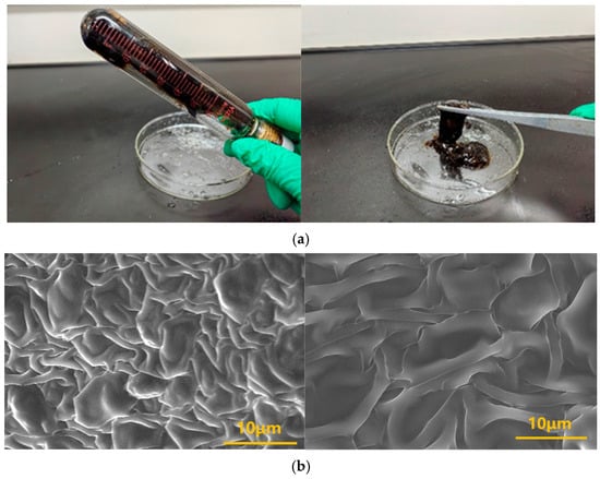 The polymer gel solution was transferred into temperature/pressure-resistant bottles and placed in a constant-temperature drying oven for crosslinking reactions under high temperature. Gelling time and strength were assessed using the Sydansk bottle test method []. Gelling time was recorded when gel state stabilized, and gel strength was classified into nine grades [] based on inverted suspension and protrusion states: A (discontinuous), B (highly fluid), C (fluid), D (moderately fluid), E (slightly fluid), F (highly deformable non-fluid), G (moderately deformable non-fluid), H (slightly deformable non-fluid), I (rigid). All experimental data represent precise results averaged from triplicate experiments.