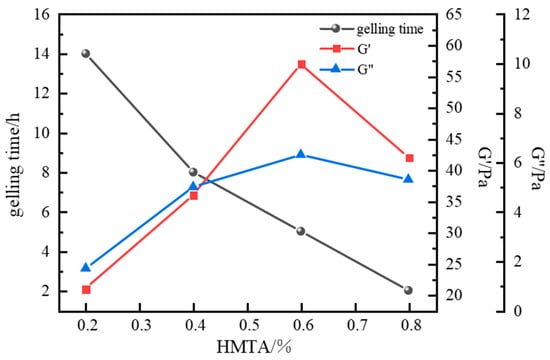 Results indicate that HMTA concentrations ranging from 0.2% to 0.8% successfully crosslinked with the polymer at 120 °C, forming intact gel systems of varying strengths. HMTA concentration exhibited a significant negative correlation with gelling time, with overall gelling times ranging from 2 to 14 h. At an HMTA concentration of 0.2%, crosslinking was insufficient, forming only a weak primary network with a storage modulus (G′) of 21 Pa and a loss modulus (G″) of 1.7 Pa. As HMTA concentration increased to 0.6%, the density of active crosslinking sites substantially increased, significantly enhancing gel strength. The G′ and G″ reached 57 Pa and 6.3 Pa, respectively, indicating excellent viscoelastic properties. However, a performance inflection point occurred beyond 0.6% concentration, resulting in decreased gel strength. This decline is attributed to excessive crosslinking at high crosslinker concentrations. The drastically increased reaction rate leads to over-crosslinking, increasing the proportion of network defects and hindering the formation of a stable crosslinked structure. Based on the principle of performance optimization, an HMTA concentration of 0.6% was selected.