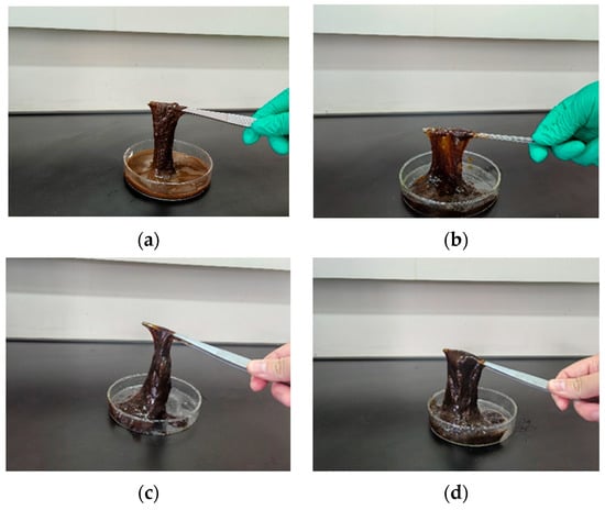 Gel state at different catechol concentrations: (a) 0.1% catechol; (b) 0.2% catechol; (c) 0.3% catechol; (d) 0.4% catechol.