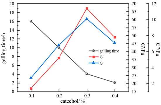 When catechol was used as the phenolic crosslinker, the resulting gels exhibited higher strength than those formed with phenol or hydroquinone. The gel system demonstrated the best wall-adhering ability and maintained excellent long-term stability, showing less than 10% dehydration after aging for 7 days at a high temperature. Therefore, catechol was selected as the optimal phenolic crosslinker. The influence of catechol concentration on gelation was further investigated. Results (Figure 10 and Figure 11) show that gelling time decreased with increasing catechol concentration, while gel strength initially increased and then decreased. At a catechol concentration of 0.3%, gel strength reached its maximum, with G′ and G″ values of 67 Pa and 10.1 Pa, respectively. The gel also exhibited high viscosity and excellent wall-adhering performance. However, when the phenolic crosslinker concentration exceeded 0.3%, the complex modulus decreased, and gel strength weakened. This observation aligns with the phenomenon seen in the aldehyde crosslinker optimization study; excessive crosslinker concentration leads to over-crosslinking and performance degradation. Consequently, an optimal catechol concentration of 0.3% was selected.