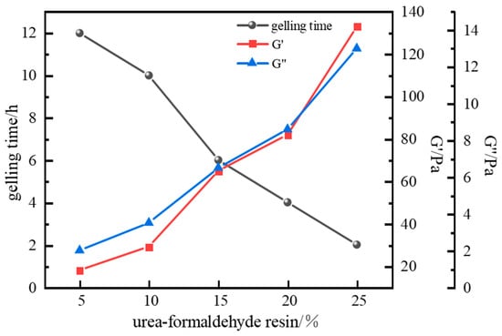 Effect of urea–formaldehyde concentration on gelling time and storage modulus.