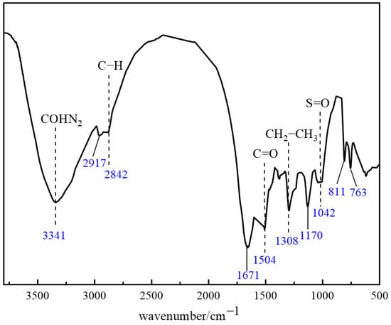 Fourier Transform Infrared Spectroscopy (FTIR) was employed to characterize the molecular structure of the thixotropic polymer gel system. Based on the above experiments, the optimized formula for the polymer gel system is as follows: 1% polymer J-1 + 0.3% catechol + 0.6% hexamethylenetetramine (HMTA) + 15% resin hardener. Vibration information in the fingerprint region (1350–400 cm−1) and functional group region (4000–1350 cm−1) revealed characteristic chemical bonding. As shown in Figure 13, the broad, intense absorption peak at 3341 cm−1 corresponds to the stretching vibration of amino (−NH2) or amido (−CONH2) groups. The characteristic peak at 2917 cm−1 is attributed to the asymmetric vibration of carboxylate (−COO−) or sulfonate (−SO3−) groups. The typical vibration signal of aliphatic C−H bonds appears at 2842 cm−1, while the dual peaks at 1671 cm−1 and 1504 cm−1 collectively confirm the C=O stretching vibration in amide groups. The strong peak at 1308 cm−1 corresponds to the deformation vibration of methylene/methyl (−CH2−CH3) groups. Significant absorption at 1170 cm−1 indicates the presence of C=O functional groups, and the peak at 1042 cm−1 relates to S=O bond vibrations. In the low-frequency region, the characteristic doublet splitting at 811 cm−1 and 763 cm−1 represents the distinctive in-plane S−O−H bending vibration of sulfonic acid groups (−SO3H).