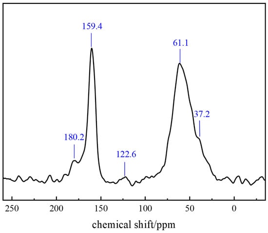 Carbon-13 Nuclear Magnetic Resonance (13C-NMR) is based on the magnetic resonance phenomenon of 13C nuclei. Under a magnetic field, 13C nuclei generate distinct energy levels. Upon excitation by radiofrequency pulses, transitions between these levels produce NMR signals. The frequency of these signals correlates with the chemical environment of the 13C nuclei, measured and converted into chemical shift (δ in ppm). As a core parameter, chemical shift reflects the carbon atom electron density distribution, providing structural information about different carbon atoms in the polymer gel system. 13C-NMR analysis of the gel (Figure 14) determined its specific chemical structure as follows: the peak at δ = 180.2 ppm corresponds to the C=O bond in amide groups; δ = 159.4 ppm to aromatic carbon atoms in benzene rings; δ = 61.1 ppm to −NH2 or −CONH2 groups in the polymer structure; and δ = 37.2 ppm to the methyl group (−CH3) in AMPS (2-acrylamido-2-methylpropanesulfonic acid) units.
