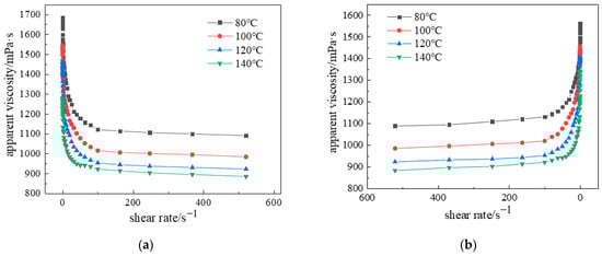 Apparent viscosity versus shear rate at different temperatures: (a) Forward shear; (b) Reverse shear.