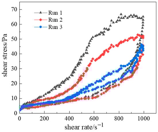 Different shear rate ranges yield distinct hysteresis loop areas. Testing at lower shear rates causes minor structural disruption, producing smaller loops. Higher shear rates induce severe structural damage, enlarging the loop area. Shear history is also critical: pre-sheared fluids may exhibit altered internal structures. Cyclic shear tests on the optimized gel solution (Figure 16) revealed that the first cycle’s hysteresis loop was significantly larger than subsequent cycles. After three cycles, hysteresis areas progressively diminished, and ramp-up/down curves nearly overlapped. This occurs because long-chain polymer molecules initially entangle in solution. During shearing, entanglements disentangle as the shear rate rises. Irreversible chain stretching or bond breakage during cyclic shear prevents full re-entanglement, reducing the area of thixotropy and hysteresis.
