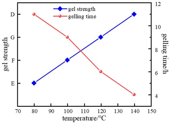 Gelling time of polymer gel systems is significantly influenced by temperature. Elevated temperatures generally accelerate chemical reactions. For chemically crosslinked gels (e.g., those formed by polymer–crosslinker polycondensation), high temperature increases reaction rates between polymer molecules and crosslinkers by enhancing collision frequency, expediting crosslinking. Temperature also critically affects gel strength. Higher temperatures promote polymer chain extension and stronger intermolecular interactions. At optimal temperatures, enhanced chain entanglement and crosslinking improve gel strength. However, excessive temperatures may degrade the 3D network; intense molecular motion can break chemical bonds and crosslinking points. To evaluate temperature effects (80–140 °C) on gelling time and strength, experiments used the optimized formulation as a high-temperature in situ crosslinked polymer gel system (Figure 17).