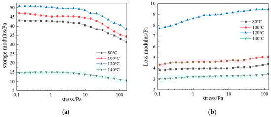 Data in Figure 17 show gelling time decreased from 11 h (80 °C) to 4 h (140 °C). Figure 18 reveals that storage modulus (G′) varied considerably with temperature and decreased with stress, while loss modulus (G″) increased with stress but showed smaller temperature variations. Under identical stress, G′ consistently exceeded G″, confirming superior elasticity essential for effective loss-zone plugging. At 120 °C, optimal crosslinking achieved maximum complex modulus, with G′ and G″ stabilizing at 50 Pa and 9.5 Pa, respectively, indicating a high-strength 3D gel network with optimal viscoelasticity. At 140 °C, accelerated molecular motion reduced crosslinking density and gel strength.