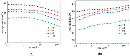 Effect of temperature on complex modulus: (a) Storage modulus; (b) Loss modulus.
