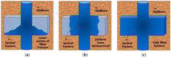 Self-adaptive uniform fracture filling process: (a) Bottom filling; (b) Uniform advancement; (c) Complete filling.