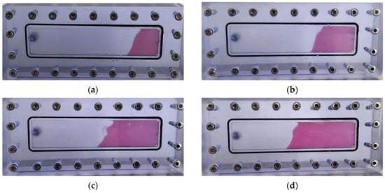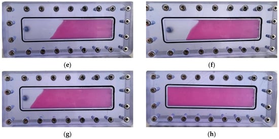 Self-filling progression at different injection volumes: (a) 0.2 PV; (b) 0.3 PV; (c) 0.4 PV; (d) 0.5 PV; (e) 0.6 PV; (f) 0.7 PV; (g) 0.8 PV; (h) 1.0 PV.