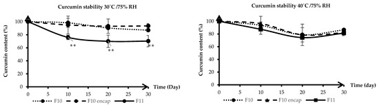 Stability of curcumin granules at 30 °C/75% RH (left) and 40 °C/75% RH (right) over 30 days. Lines represent mean curcumin content (%), and error bars indicate standard deviation (SD). F10 stands for HA-g-pNIPAM physically mixed with curcumin, F10 Encap symbolizes curcumin encapsulated within HA-g-pNIPAM, and F11 represents curcumin granules without HA-g-pNIPAM. ** indicates statistical significance at p < 0.05 (n = 3).
