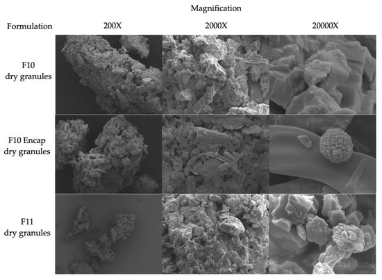 F10 and F10 Encap exhibited similar granule’s surface. F11 also showed the base granules’ surface which comprised curcumin, PVP K-30, mannitol, and L-HPC. The image complied with the previous studies [14,15,16,17].
