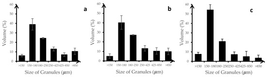 The particle size distribution of the three formulations was relatively consistent across the three replicates, indicating good reproducibility in the granulation process (See Figure 4). The 150–180 μm size range was the most common size for the granules produced, which would be desirable for uniformity in drug delivery and processing. Shekunov et al. suggested that smaller particle sizes (20–50 μm) were optimal for chewable and fast-disintegrating tablets, while larger sizes (100–200 μm) were suitable for direct-compression tablets mostly because of their required compaction behavior and powder flow properties [18]. This suggested that all formulations showed suitable and consistent particle size distribution.