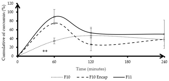 Cumulative dissolution of curcumin (%) in gastric condition. Lines represent the mean, and error bars indicate standard deviation (SD). F10 stands for HA-g-pNIPAM physically mixed with curcumin, F10 Encap symbolizes curcumin encapsulated within HA-g-pNIPAM, and F11 represents curcumin granules without HA-g-pNIPAM (n = 3). ** indicates statistical significance at p < 0.05.