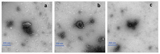 TEM was applied to verify the size and shape of the curcumin encapsulated in HA-g-pNIPAM. Also, it helped confirm that HA-g-pNIPAM remained after the solidification. The previous study showed that the particle size of curcumin loaded in the nanogel was around 100–300 nm [9]. From Figure 7a, we could observe the HA-g-pNIPAM nanogel and curcumin separately. As Figure 7b suggested, curcumin was incorporated in HA-g-pNIPAM which had a spherical shape and size of around 100–300 nm. From Figure 7c, F11 showed curcumin particles which could be used to interpret that curcumin was encapsulated in the nanogel.