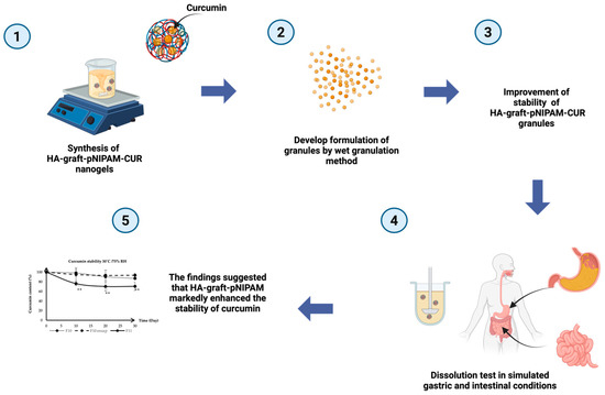 The schematic diagram (see Figure 8) provided a comprehensive visual summary of our research methodology, the development of the curcumin-loaded HA-g-pNIPAM nanogel granules, and the key findings related to enhanced stability and dissolution for oral drug delivery. The process started from the (1) synthesis of curcumin-loaded HA-g-pNIPAM nanogels, forming the foundational drug delivery system. These nanogels were then (2) successfully incorporated into granules via a wet granulation method. This formulation approach led to a significant (3) improvement in the stability of the HA-g-pNIPAM-CUR granules. The in vitro performance of these granules was rigorously assessed through (4) dissolution tests conducted under simulated gastric and intestinal conditions. Ultimately, these evaluations consistently demonstrated that (5) the HA-g-pNIPAM formulation markedly enhanced the stability of curcumin granules, thereby achieving the objective of the study.