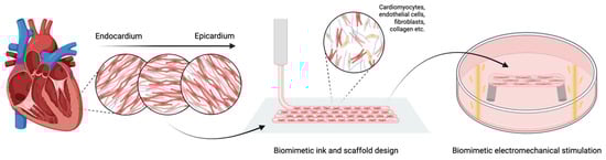 Integration of biomimetic ink, scaffold design, and physical stimulation to promote cardiac tissue maturation. Created in BioRender https://www.biorender.com/ (accessed on 18 July 2025).