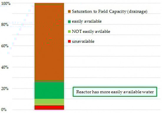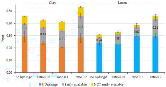 Soil particle size is an important factor in water retention and varies according to the mineral composition of the soil []. In this sense, the dry density of the fine fraction (pd-f) also plays a determining role in the shape of the soil water retention curve (SWRC), especially at lower suctions []. According to the authors, SWRC is sensitive to variations in pd-f when the matric suction is below 715 kPa, and this behavior is associated with the predominance of interaggregate pores, which are more susceptible to compaction. At higher suctions, intra-aggregate pores begin to dominate water storage, and SWRC becomes virtually independent of the density of fines. The authors also observed that increasing the dry density of fines reduces the proportion of interaggregate pores, leading to lower water retention capacity at low suctions. In the case of Loam soil, total water retention is lower than in Clay soil, due to the size of soil particles, with less clay and micropores, as well as having less resistance to hydrogel swelling, with the positive effect of increasing the content of easily available water. In this sense, the pronounced and increasing effect of the addition of cellulose-based hydrogels in soils with a coarser texture has already been presented in the literature [,,], by altering the physical structure of the soil by reducing macropores or drainage pores [].