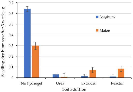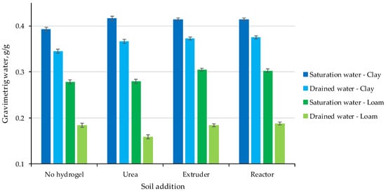 In contrast, when evaluating water retention in clay and sandy loam soils with the addition of 4 and 6 g/kg of the commercial hydrogel Superab A200, the authors obtained as a result an increase in the volumetric water content proportional to the amount of hydrogel applied, with a superior performance in coarse-textured soils with the addition of hydrogel []. In our research, applications of 50, 100 and 200 g/kg were evaluated, so the strengthening water content may have been overestimated by the high dose of hydrogel applied. This difference can also be observed in the form of application, which the previous authors applied in dry form, while the hydrogel reactor and extruder hydrogel samples presented 0.25 g/g of water weight.