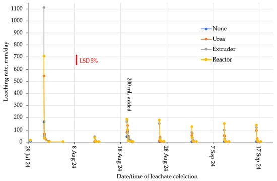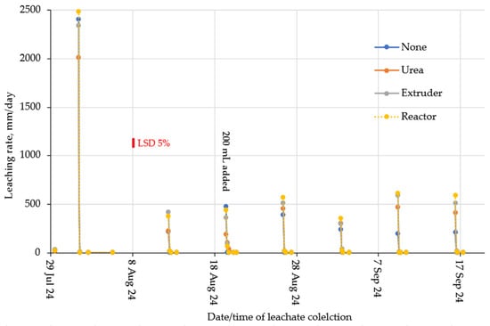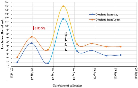 The amount of leachate collected at the different leaching events was not affected by the hydrogel or urea treatments but was higher for the loam compared to the clay (Figure 7). Therefore, soil texture was the main factor influencing drainage dynamics, with higher leachate volumes in loam soil in all events due to its greater macroporosity and hydraulic conductivity, which favor water percolation. On the other hand, the greater water retention in clay soil can be explained by the predominance of micropores, which favor retention by matric forces. Furthermore, after the addition of 200 mL of water, there was a reduction in collected volumes, suggesting internal moisture redistribution or greater water retention in the lower soil layers, especially in clay. The reduced leachate collected from the clay was probably due to higher evaporation rates or very slow final leaching rates.