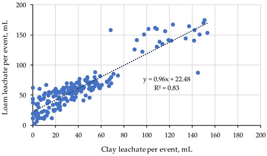 There was a close relationship between the leachate collected from the loam and clay (Figure 8). The intercept of the regression (22 mm, Figure 8) is the average difference between leachate from the loam and clay soils. It suggested that leaching from the clay continues after we assumed that leaching had reached an end point. This may be due to lower leaching rates in the clay due to its lower hydraulic conductivities at high water contents compared to lighter textured soils [].