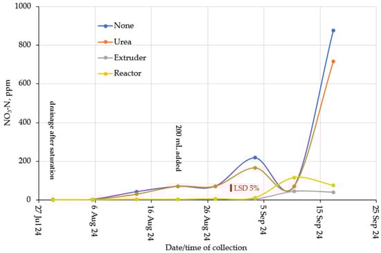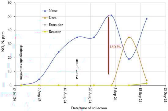 The total Nitrogen and fractions are given in Figure 15 (NH4-N), Figure 16 (NO3-N), and Figure 17 (NO2-N). Almost all N was leached as Ammonium and the proportion of NH4-N as part of the total was highest for the hydrogels. However, doubling the application rate of hydrogels increased the fraction of Ammonium, simply because there was more of it. This can be explained by the fact that hydrogels increase water availability in the soil and facilitate ammonium mobility, with a rapid release of nutrients present on the hydrogel surface soon after swelling, which then tends to be reduced and controlled with the release from the hydrogel matrix []. Superabsorbent and fertilizer hydrogels have a nutrient dissolution rate that depends on the physical properties of the material, such as porosity and hydrophobicity; the more porous and hydrophilic the material, the greater the release of NH4+ [].